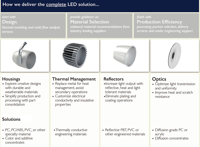 我们可以采用技术方案的组合,帮您打破如今的限制, 该组合从镜头和反光器到散热器,再到外壳,将实现您的LED照明系统的转变。